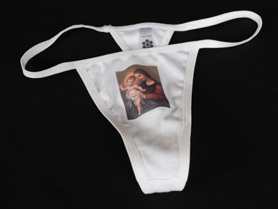 Previous | Next | Index For those with catholic tastes in the bedroom, here come thongs of praise. These pious undervestments combine devotion to the Mother of God with the prevention of visible panty lines, and bring some welcome holiness to any underwear-related activity. Do I hear an "Amen"? Brothers, pop a righteous g-string in the stocking of the lady in your life this Christmas, and she will be blessed among women. Sisters, try these on for him, and put the guilt back in your sex life where it belongs. Madonna and child knickers are $12.99 for a pair. Click here to order! |