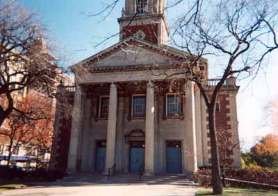 Mystery Worshipper: Shy Town. The church: First Congregational, Grove Street at Hinman, Evanston, Illinois. Denomination: Technically, none (since it's purely congregational), but they are affiliated with a confederation of like churches called the National Association of Congregational Christian Churches (NACCC), headquartered in suburban Milwaukee. Most congregational churches in America joined with another group to form the United Church of Christ (UCC), but many that opted out are now with the NACCC. It took five years for the UCC to get off the ground (1957-1962), and I've been told there was a great deal of litigation over turf during that time. In other words, the legal doings were more over land rights than theology. The building: Lots of people call this style "colonial revival," but as any architect can tell you there wasn't much during pre-revolutionary days to revive. The half-moon transoms suggest Christopher Wren, but there is a Greco-Roman portico, spiced up with Corinthian colums and filials. The exterior is brownish-orange brick. At first glance, the building looks like the sort of church Andy Hardy and his family would have attended. I'm also told that some of its design elements were borrowed from St Martin's-in-the-Fields, London. The church: Evanston has a reputation of being a WASP enclave, and a snobbish one. That has worn away somewhat over the years as the town ceased to be exclusively white and different ethnic groups moved in. The people at First Congregational are stereotyped as the elite, so I wanted to witness the "Old Evanstonians" in their element, and before they die out. The neighbourhood: The church sits at the apex of a greensward, the other two poles being First Presbyterian Church and Lake Street Church of Evanston (Northern Baptist). First Congregational is only a block or two from the downtown business district. And the closer one approaches Lake Michigan to the east, the wealthier the homes: from 1920's wrap-around porch affairs to real mansions right on the lake. The cast: Thomas Miller, Senior Minister; Christine Meyer, Minister of Spiritual Formation and Christian Education; and (very good) organist David Lornson, Director of Music. |