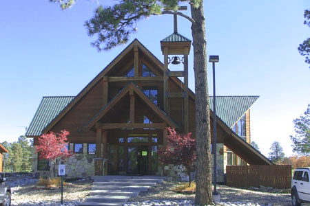window depicting the Good Shepherd. A pine communion rail separates