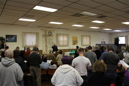 They meet at the Sacred Heart Community Center, a modern, long and flat building with two entrances on the one side. It has wood floors, stacking chairs, a portable altar and a music area.