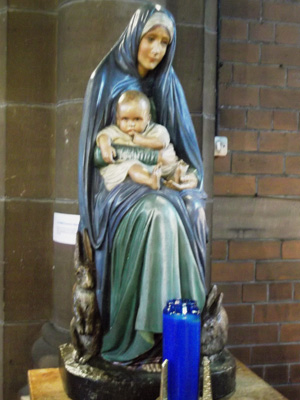 The building: A Victorian Gothic dark red brick building adorned with flying buttresses, a circular bell tower, and a green copper steeple. The imposing interior is flooded with natural light from the clear glazed east window and clerestory. The wide, lofty nave is graced by a finely carved and delicately decorated oak screen. There were seven sanctuary lamps gently swinging. A gold triptych reredos depicts the four evangelists and Jesus on the Cross with Our Lady and St John. The blue carpeted Lady chapel features a "little house" style tabernacle for the reserved Sacrament and a statue known as the Rabbit Madonna, after the rabbits nestled at the Virgin's feet. This is the work of a nun named Mother Maribel, whose carvings can be found in many churches and cathedrals, including St Paul's. (Rabbits are sometimes seen as representing the Virgin Birth scholars as far back as Aristotle have known that rabbits can conceive while pregnant, a phenomenon known as superfoetation, thus making it seem that they can bear offspring without having had intercourse.) Interestingly, Mother Maribel's statue depicts the infant Jesus with only four toes on one foot and a normal complement of toes on the other.