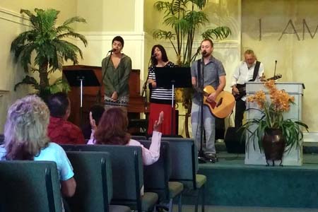 The building: This is the oldest church in Oceanside, having been built in 1886 as a Congregational church. It was sold to the Methodists in 1896 and was occupied by them until 1995. It has a traditional churchy look both inside and out, with the inside featuring pointed arches, chandeliers, and abstract stained glass. A stage holds a lectern, musical instruments, and a variety of potted plants; with “I AM” in large letters on the back wall.