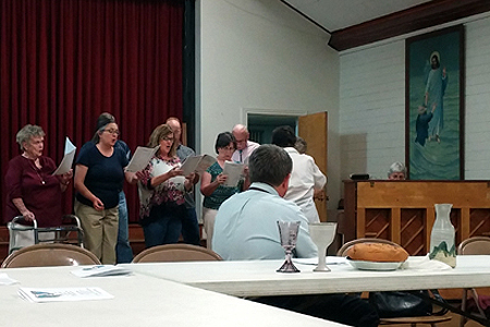 The building: An attractive modern barn-like building with parish hall off to the right. The setting sun made a tall copper panel on the facade glow beautifully; unfortunately my camera overexposed it. Tonight’s service actually was held in the parish hall, in a rectangular room with white brick walls and a stage at one end. Folding tables had been arranged in the center of the room in a rectangular pattern, so we could all sit around the tables and see each other. A loaf of bread, a carafe of grape juice, and two glass chalice-shaped cups were on a white cloth on the table in front of where the pastor was sitting.