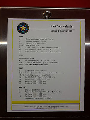 I was amused to see a schedule of upcoming events posted on, of all places, the towel dispenser in the rest room!